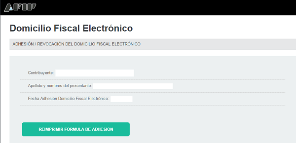 A tal fin, dichos sujetos deberán ingresar con su clave fiscal a Servicios Administrativos / Domicilio Fiscal Electrónico y allí completar la DDJJ de adhesión al mismo. Una vez realizada la adhesión, se podrá imprimir la DDJJ que será similar a la que se exhibe a continuación: